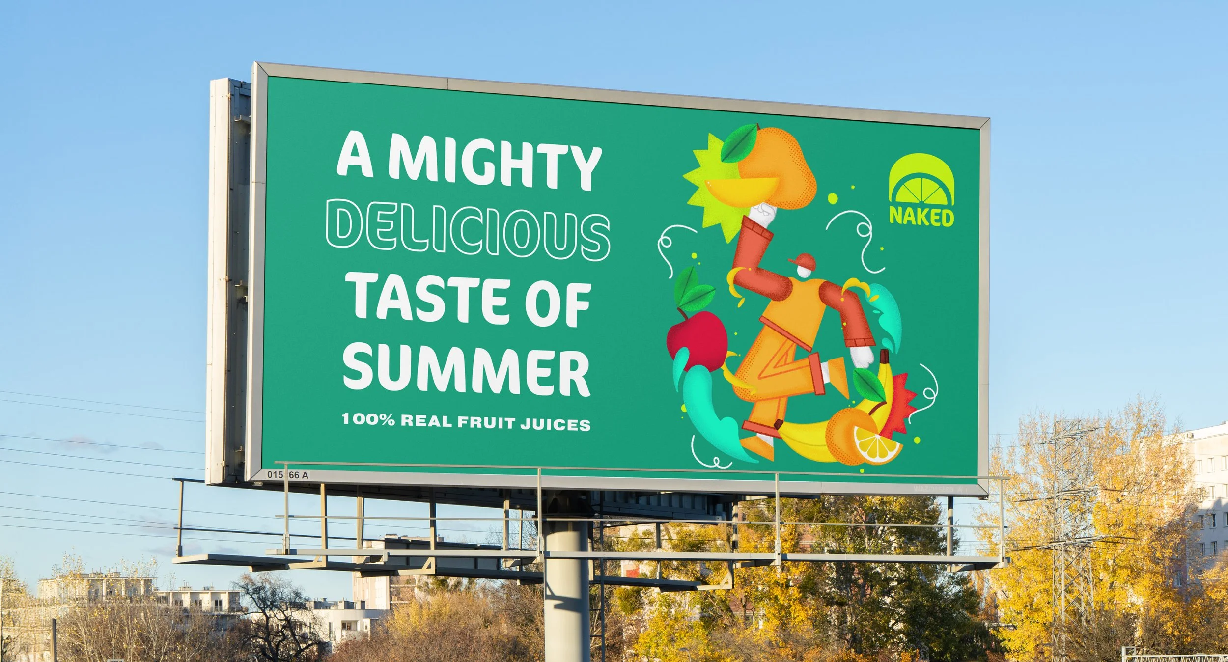 Naked Juice was founded in 1983 by Jimmy Rosenberg in Santa Monica. Originally a entrepreneurial venture, Rosenberg sold to local beaches and markets before gaining recognition throughout the 80s and 90s. The goal was to enhance brand personality while maintaining its core values of natural ingredients, no additives, and vibrant nutrition. Custom illustrations were created to bring a fresh and dynamic visual identity to the product line.
